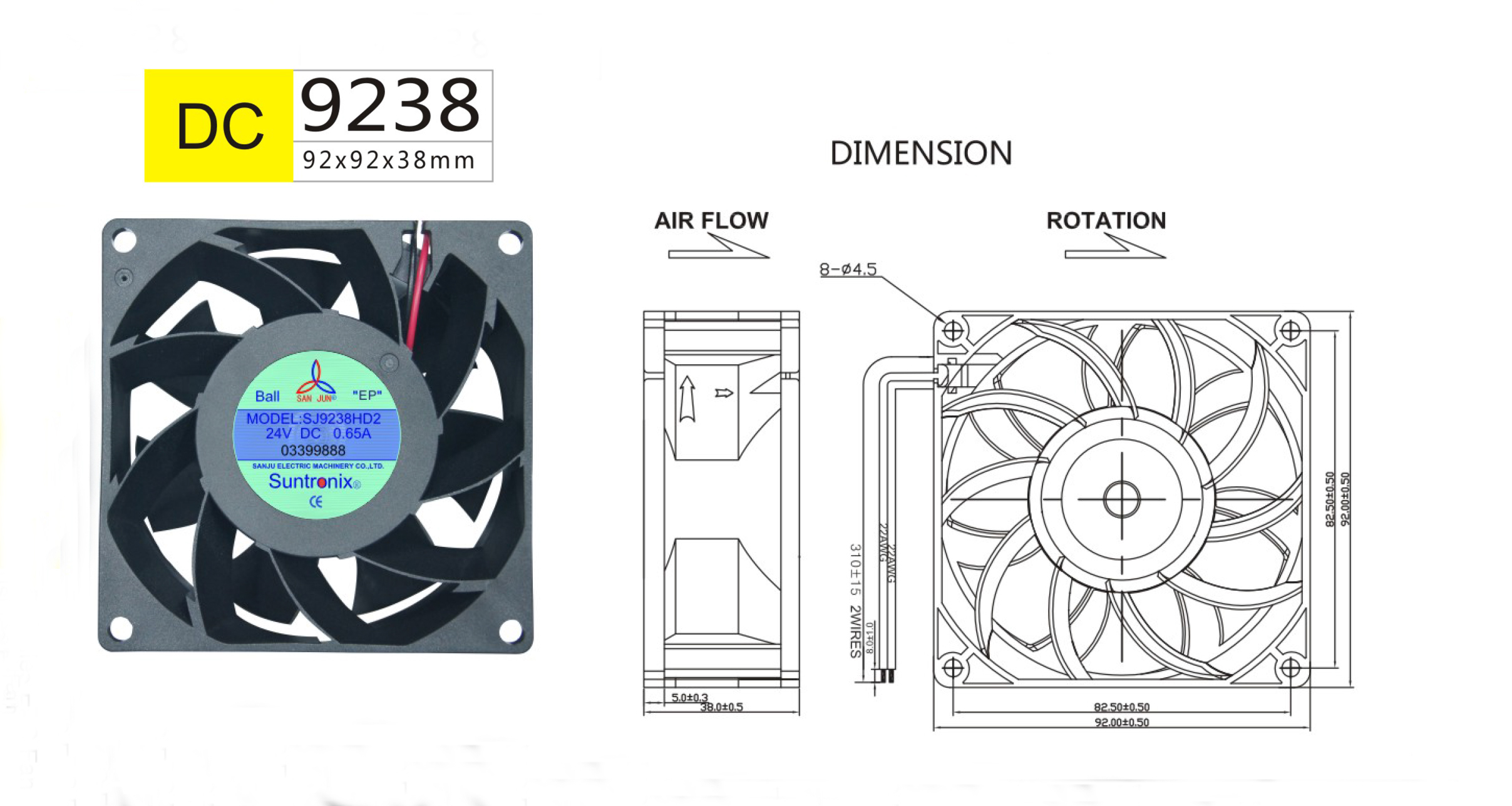 尺寸:92x92x38mm 框架: UL94V-0 PBT 軸承: 含油軸承& 雙滾珠軸承 電壓:DC 5V 12V 24V 48V 壽命:50 000Hours at 25℃--滾珠軸承 30 000Hours at 25℃--含油軸承 工作溫度:-20℃~70℃ 正常濕度 儲存溫度:-20℃~85℃ 正常濕度